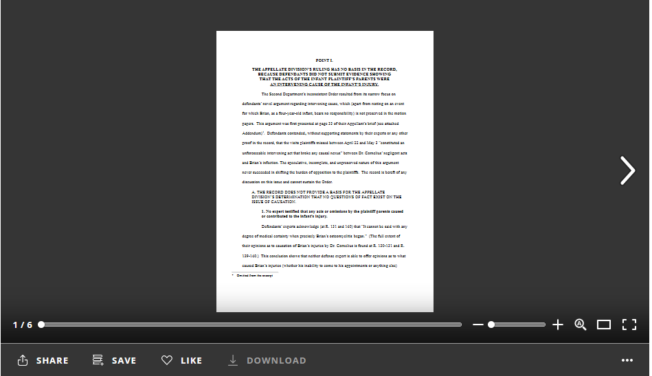 This matter involved a four-year-old child (“Brian Waldorf” or the “infant plaintiff”) who contracted a bone infection following allegedly improper treatment of a skin infection by the defendant physician (“Dr. Cornelius”). After completion of discovery, the defendant moved for summary judgment claiming that her treatment was not improper and even if it was, it did not cause the child's injury. The trial court denied the motion, but the Appellate Division, Second Department, reversed on the basis of an argument that the defendant had not raised before the motion court. Our motion for leave to appeal was based on the Appellate Division's mistaken conclusion that while the defendant may have erred in the treatment she provided to the child, the fact that the child's parents did not bring him to a series of followup appointments meant that the error did not cause the injury. After the Court of Appeals granted our motion, we filed a brief explaining that the appellate result was in derogation of a state law that is directly on point, and furthermore that a party may not present new arguments to the appellate court which were never put to the motion court. Our alternative argument – which the Court of Appeals ultimately endorsed – was that the defendant never met her initial burden of proof on a motion for summary judgment, because she did not present evidence to show that she did not cause the plaintiff's injury.